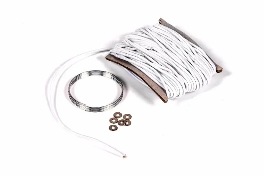 Standaard wordt er een stukje ijzerdraad meegeleverd voor het doorrijgen van het elastiek door de stokken en de ringetjes dienen als stopplaatje waar je de knoop achter legt.