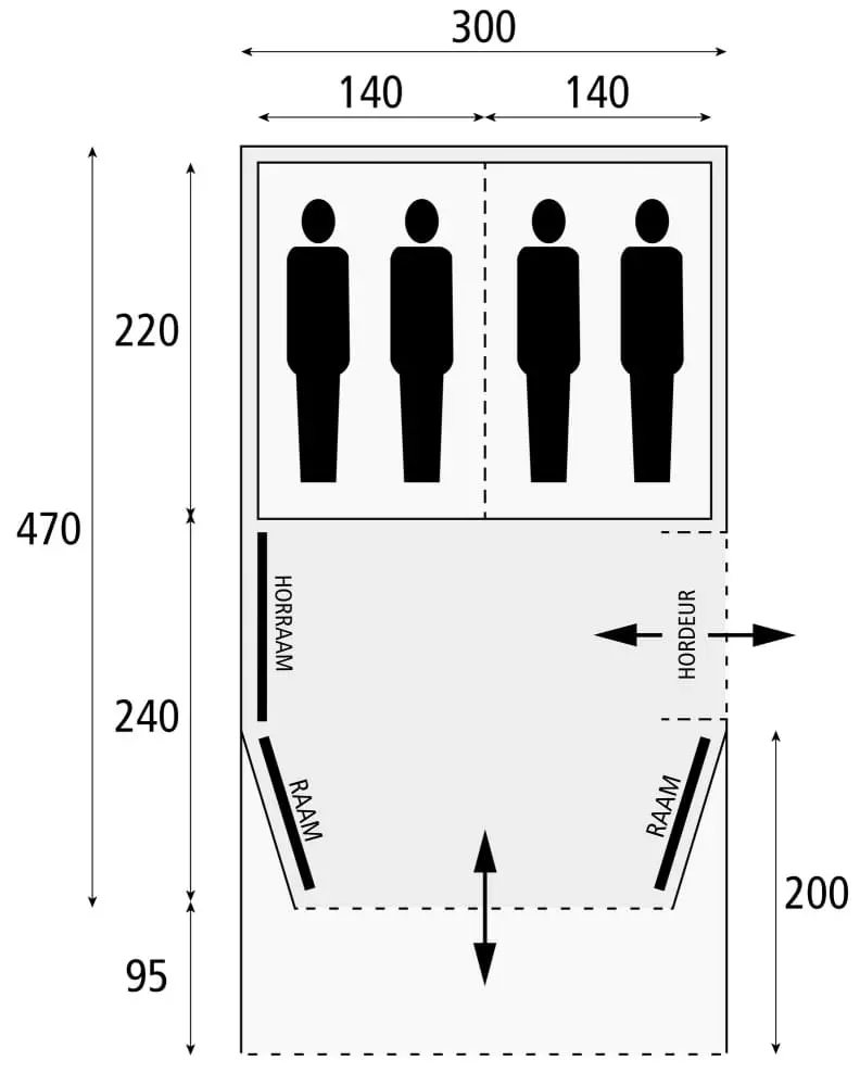 Er is bij deze tunneltent een grote luifel meegeleverd die middels een rits gemakkelijk vastgemaakt kan worden aan de voorkant. Er is een handig doorvoer-syteem voor een stroomkabel in de zijkant van de tent met ritssluiting gemaakt. Via de rechter zij-ingang kan de tunneltent worden benaderd en deze is voorzien van een horrengaasdeur. De ramen zijn voorzien van gordijnen die alles lekker donker maken.