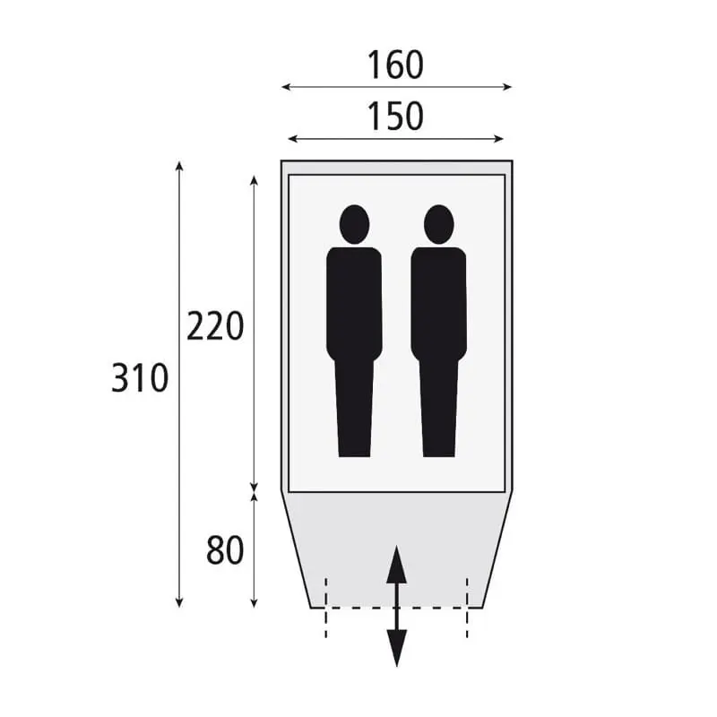 Zowel de slaapruimte als de voortent van de Kenia 160 TC zijn voorzien van een vast PE kuipzeil. In de voortent heb je voldoende ruimte om schoenen en andere spullen op te bergen.