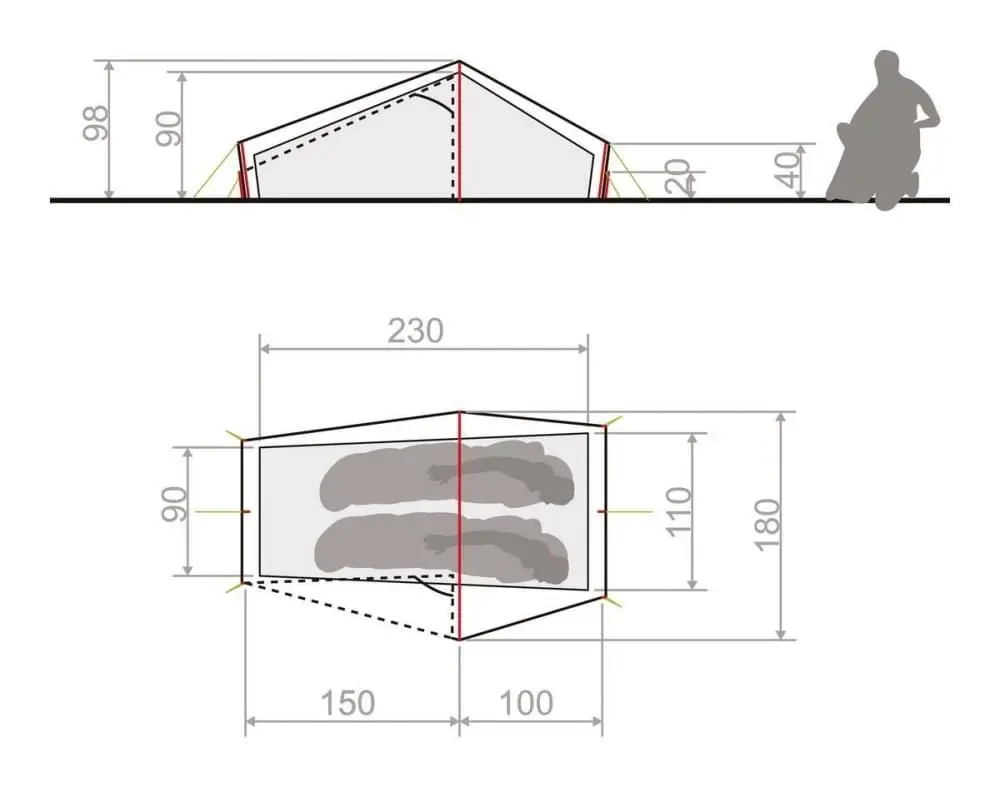 - Buitentent: 100% Nylon 20D Ripstop beide zijden Siliconen Coating 3000mm